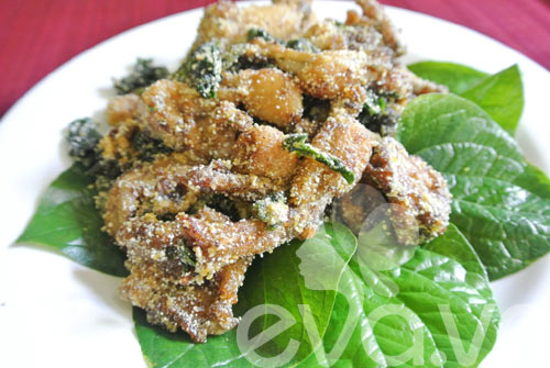 Bước 5: Nhanh tay thả luôn phần lá lốt đã thái khúc ngắn vào chảo dầu vừa chiên ếch, chiên cho lá lốt có độ giòn rụm.