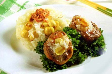 Bồ câu nhồi xôi hạt sen March 19, 2012 $ave Nguyên liệu: 2 con chim bồ câu 200g gạo nếp 50g hạt sen tươi 50ml nước cốt dừa đặc 50ml nước dão dừa 4 củ hành tím 3 tép tỏi 3 lát gừng 2 thìa cà phê nước tương, 1 thìa cà phê mật ong 1 thìa cà phê rượu trắng ½ thìa cà phê hạt nêm ¼ thìa cà phê muối Các bước thực hiện: Bước 1 Bồ câu mổ moi bỏ lòng, rửa sạch để ráo. Tỏi và gừng bằm nhuyễn, trộn với rượu trắng và hạt nêm, thoa khắp trong và ngoài mình bồ câu, để khoảng 20 phút cho thấm. Gạo nếp ngâm trước với nước ấm khoảng 1 tiếng, vớt ra để ráo, trộn với muối và nước cốt dừa đặc, đem đồ trong chõ cho chín mềm. Bước 2 Nhồi gạo nếp vào trong mình bồ câu, dùng kim chỉ khâu kín lại rồi cho vào nối hấp, hấp chín chim bồ câu. Lấy chim ra, thoa nước tương lên mình chim rồi cho vào chảo ngập dầu chiên vàng, hoặc đun sôi dầu rồi xối lên mình chim liên tục cho đến khi da vàng giòn đẹp. Bước 3 Hành tím xắt lát phi vàng, rắc lên phần xôi còn lại, chặt chim ra dùng nóng với xôi. Đun sôi nước xốt chấm bằng nước tương còn dư sau khi ướp chim trộn với mật ong. Thêm chút nước dừa dão nấu cho sôi liu riu là được. Dùng với bồ câu nhồi xôi. Nguồn từ trang: tapchiamthuc