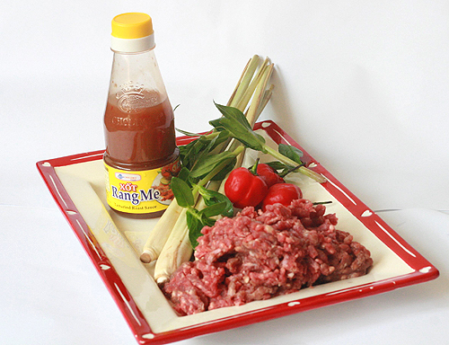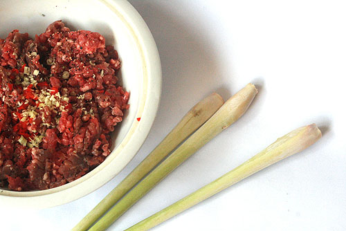 -Trộn sả và ớt với thịt bò, nêm gia vị, hạt tiêu, ướp khoảng 10 phút cho thịt ngấm