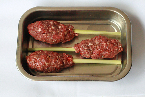 -Lấy 1 phần thịt bọc quanh cây sả, dùng tay nắm kĩ để thịt ôm khít lấy cây sả, nếu nắm không chắc tay khi nướng thịt sẽ bong ra