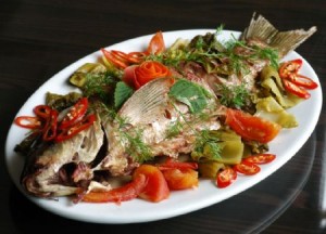 – Cho cá, dưa cải ra dĩa. Trang trí thêm đầu hành, ớt đỏ.