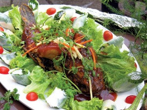 Làm nước xốt: me vắt, tương cà, tương ớt, nửa muỗng nước mắm ngon, 3 muỗng đường nấu cho sánh; sau đó chế lên cá đã chiên vàng. Làm nước mắm lạt chấm. Trang trí với lá sen non, ớt sừng trâu, củ cải đỏ, ngò rí cho đẹp mắt. Món này để cuốn bánh tráng với bún và rau sống, chuối, khế…