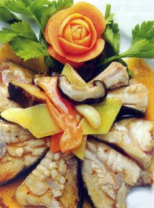 Tỏi lột vỏ. Gừng xắt hình thoi, nấm đông cô rửa sạch, cà rốt tỉa bông. Trụng tất cả qua nước sôi, rồi xào sơ. Đổ sốt vào đun sôi cho sánh lại rồi rưới lên cá đuối.