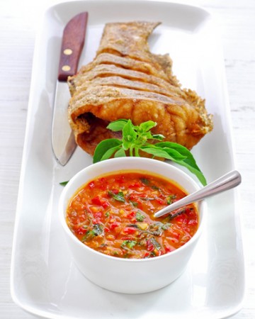 Cá xốt tỏi ngon tuyệt hảo May 14, 2012 $ave Nguyên liệu: 400g cá tùy chọn 1 muỗng canh muối 2 muỗng canh bột năng 1 củ hành tây xắt nhỏ Nước cốt chanh 6 nhánh tỏi băm nhỏ Ớt tùy theo sở thích 100g nước 2 muỗng canh đường 2 muỗng canh nước mắm 20g lá húng quế tươi 2 muỗng canh dầu ăn Các bước thực hiện: Bước 1 Làm sạch cá với nước lạnh. Rắc một chút muối và thoa đều lên trên các phần của con cá. Rắc tinh bột khoai mì và bột mì đồng đều. Bước 2 Đun nóng dầu trên chảo vừa, cho cá vào chiên khoảng 6 phút rồi tắt bếp, vớt cá ra để sang bên. Tiếp tục đun nóng dầu, cho hành tây, tỏi vào phi thơm khoảng 30 giây. Thêm ớt, xào nhanh trong vòng 1 phút. Bước 3 Kết hợp nước, nước cốt chanh và đường với nhau, cho vào chảo, đảo nhanh tay với nhiệt độ thấp trong vòng 2 phút. Thêm nước mắm vào. Bỏ lá húng quế vào chảo, đảo nhanh tay và tắt bếp. Bước 4 Múc nước xốt ra đĩa và trang trí với lá húng quế cho bắt mắt. Cá ăn kèm với nước xốt này và cơm trắng thì rất hợp đấy. Nguồn từ trang: xinhxinh