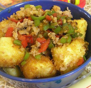 Sắp đậu rán giòn vào bát, khi ăn tưới nước sốt lên.