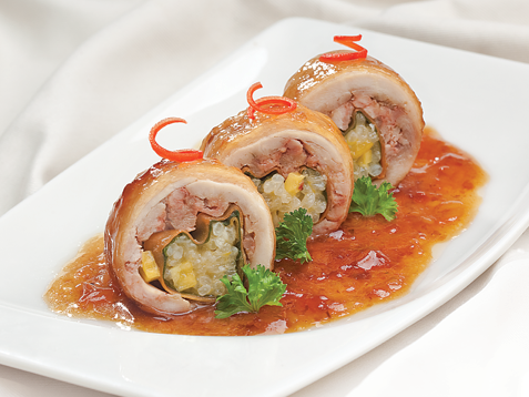 – Cuộn gà cắt khoanh, xếp ra dĩa, thêm nước quay lên trên, dùng nóng.