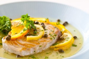 – Khi lật cá, cho thêm hai thìa bơ, một chút rượu vang, nụ bạch hoa và vài lát chanh, cam thái mỏng vào chảo. Đổ thêm một thìa nước cốt cam và chanh vào chảo, đến khi sốt bắt đầu sủi bọt lăn tăn thì vặn lửa nhỏ nhất, rồi đun từ 1-2 phút.