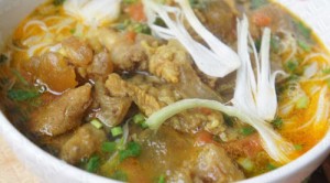 Bánh phở chần qua nước sôi, sắp hành, rau mùi lên trên. Tiếp đó bạn múc 1 muôi gân hầm…