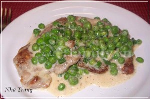 – Trong chảo khác, cho chút xíu bơ hoặc dầu ăn vào. Cho đậu Hà lan vào đảo đều. Đổ sữa tươi hoặc kem tươi vào, để lửa trung bình đừng để hỗn hợp kem sôi bùng lên thì xốt kem sẽ bị vữa, không ngon.