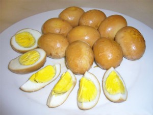 Luộc chín trứng, bóc vỏ, cho vào nồi, thêm hành, gừng, nước, sốt đậu tương (xì dầu), rượu, dầu ăn, nêm gia vị, đậy vung, đun sôi, vừa lửa chừng 25 phút cho ngấm.