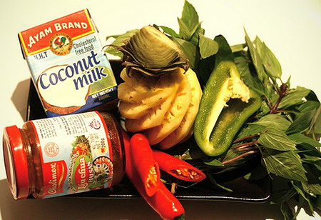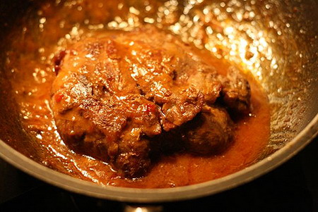 Quả dứa thái mấy lát dùng để trang trí còn lại ép quả dứa lấy nước. Cho phần nước dứa này vào chảo, nêm 2 thìa to sốt lẩu chua cay, 2 thìa nước cốt dừa, ngoấy cho nước sốt quện nhau rồi thả vịt vào om khoảng 10 phút mỗi mặt.