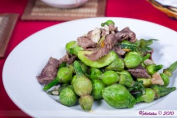 Bí non xào thịt bò March 1, 2012 $ave Nguyên liệu: 400g bí non 100g thịt thăn bò hoặc bắp bò, thái miếng mỏng 2 tsp nước mắm 1 tbs dầu hào 1 củ tỏi, đập dập 1 tbs dầu ăn Hạt nêm Các bước thực hiện: Bước 1 Bí non rửa sạch, cắt nhỏ những quả to, quả nhỏ để nguyên. Thịt bò ướp với mắm, dầu hào và 1 chút xíu dầu ăn khoảng 15 phút. Bước 2 Làm nóng dầu ăn trong chảo, cho tỏi vào đảo nhanh tay cho thơm rồi cho thịt bò vào xào đều. Thịt bò vừa tái thì gắp ra, cho bí vào đảo. Thêm ít hạt nêm và chút nước để bí mau chín và đậm đà. Bí gần chín thì bỏ thịt bò vào xào cùng, đến khi thịt bò không còn hồng, miếng bí còn xanh và cứng là được. Nguồn bài từ trang Kokotaru