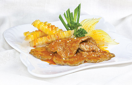 – Cho bò xào khoai tây ra dĩa, rắc tiêu lên trên, dùng nóng.