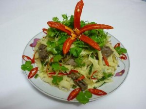 Măng xào gần chín thì cho thịt vào đảo đều, cho hành, mùi tàu cắt khúc vào, tắt bếp. Nếu ăn được cay thì cho thêm ớt. Rắc vài ngọn rau mùi lên trên.