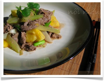 Phi hành ta cắt mỏng với dầu cho thơm. Để lửa to vừa. Bỏ thịt vào xào cho thịt vừa chín tái. Trút thịt ra tô.