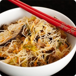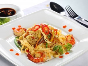 Phi thơm tỏi cho tôm vào xào, tiếp tục cho ớt chuông, cà rốt, hành tay vào xào. Cho bún gạo vào chảo, đảo đều.