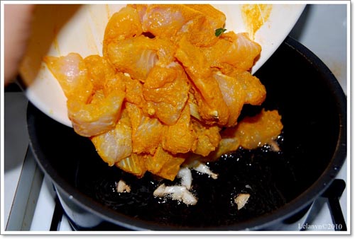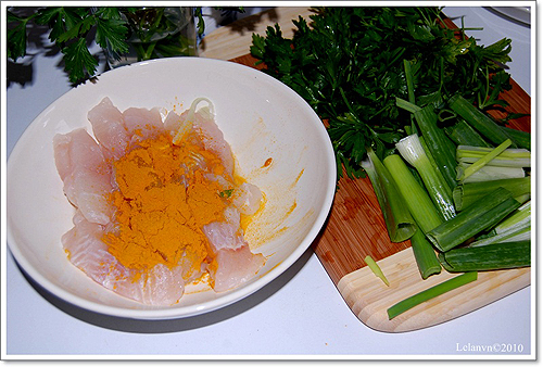 Cá cắt khúc ngắn khoảng 2 cm ướp với nghệ, muối.
