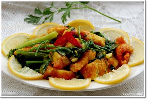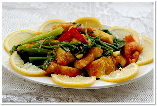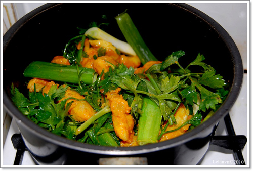 Tiếp cho hành, rau cần tây vào. Thêm chút nước và đậy nắm khoảng 5 phút cá chín.