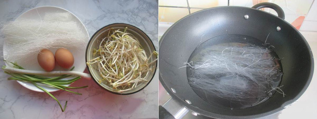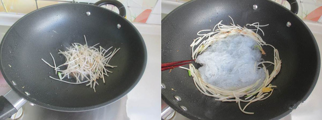 Đun nóng chảo với một ít dầu ăn, cho giá đỗ và gốc hành thái nhỏ vào xào qua tiếp đó thêm miến vào đảo chung.