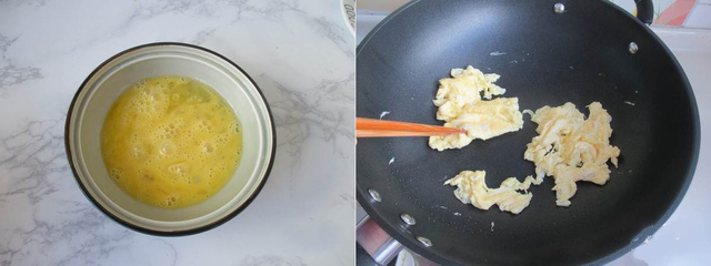 Đập trứng vào bát đánh tan. Đổ một ít dầu ăn vào chảo đun nóng, cho trứng vào đánh tơi trứng rồi trút ra đĩa.