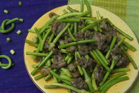 – Lấy thịt bò xào ngồng tỏi ra đĩa, dùng nóng.