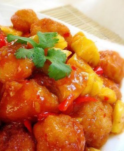 Đổ bớt dầu trong chảo ra, chỉ để lại một chút xíu, đổ chỗ thịt gà vừa chiên trở lại chảo, cho tương ớt ngọt vào. Tiếp đến cho sốt cà chua. Rồi cho dứa và ớt vào đảo đều. Nêm bột nêm cho phần sốt đậm đà vừa ăn, nếu sốt chưa đủ ngọt thì cho thêm chút đường.