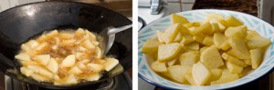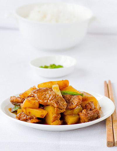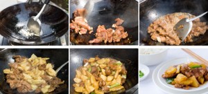 Đặt chảo trở lại bếp, để lượng dầu ăn láng chảo, cho hành tím vào phi thơm rồi đổ thịt heo vào xào. Đảo nhanh tay cho thịt chín săn. Nếu chảo hơi khô thì cho chút nước, cho tiếp khoai tây rán vào chảo thịt xào.