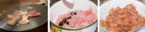 Ướp thịt với muối tiêu, chút xíu đường, 1 thìa xì dầu, 1 chút dầu ăn trộn đều để 15 phút.